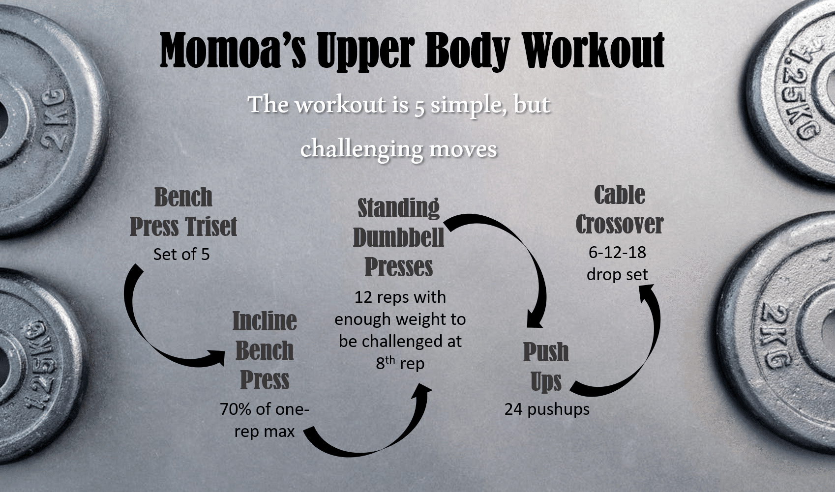 Jason Momoa’s upper body workout was comprised of five simple-but-challenging moves that fit in with Twight’s signature style. The moves were the bench press triset, push-ups, standing dumbbell presses, the incline bench press, and cable crossovers.